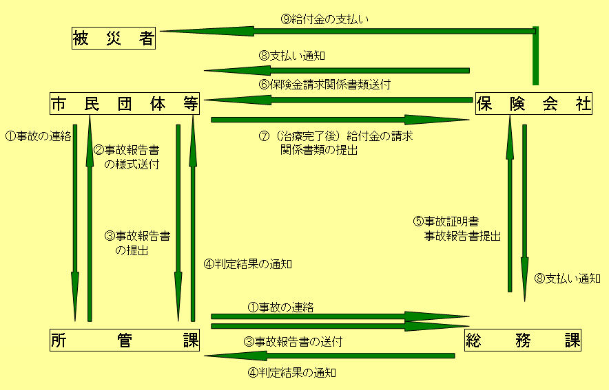 ⑨保険会社で審査後、保険金が支払われます。(団体代表者と市宛てに保険支払通知書が送付されます。)