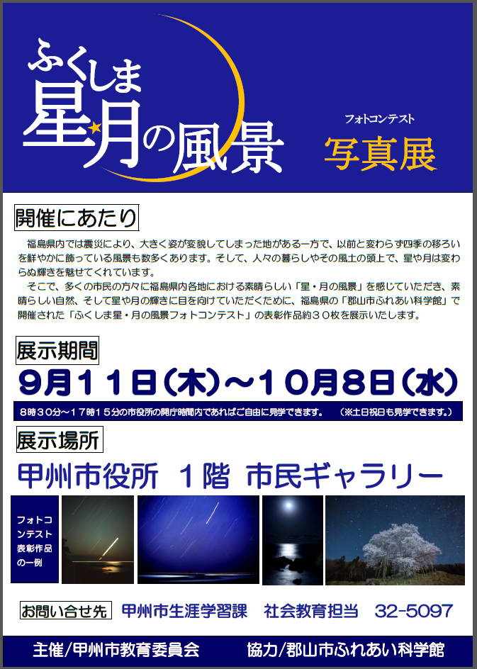された「ふくしま星・月の風景フォトコンテスト」の表彰作品を展示いたしますので、是非ご覧下さい。