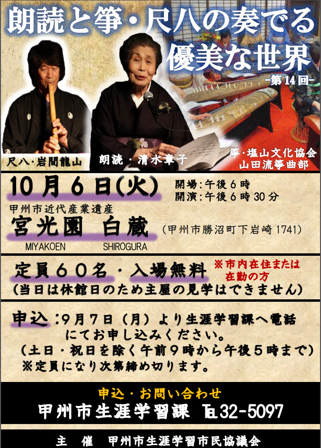 昨年、完成した宮光園・白蔵で行いますので、今までとは違った雰囲気で箏や尺八の音色と朗読を楽しんでいただけます。