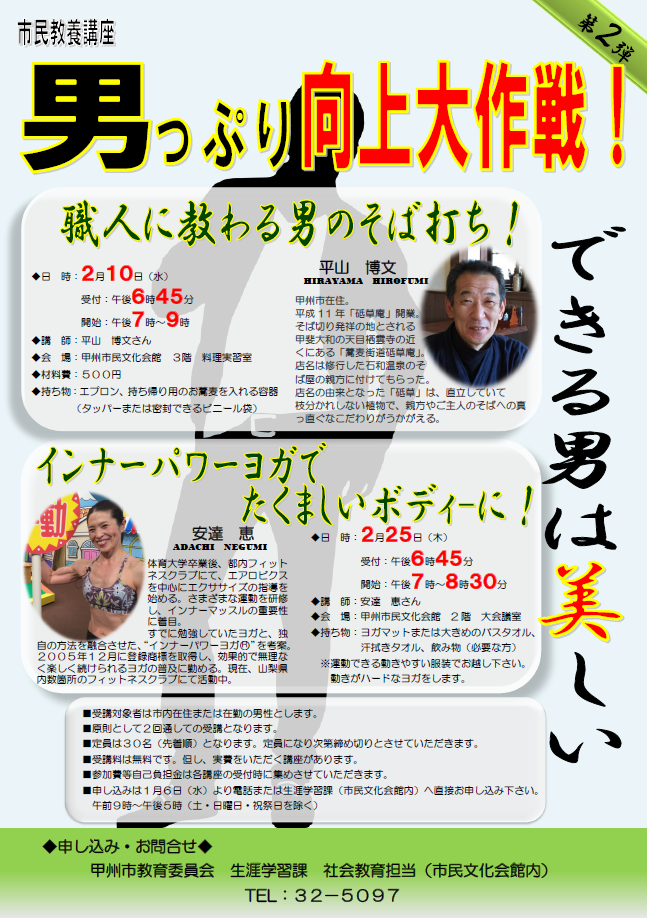 *申し込みは1月6日(水)より電話または生涯学習課(市民文化会館内)へ直接お申し込み下さい。