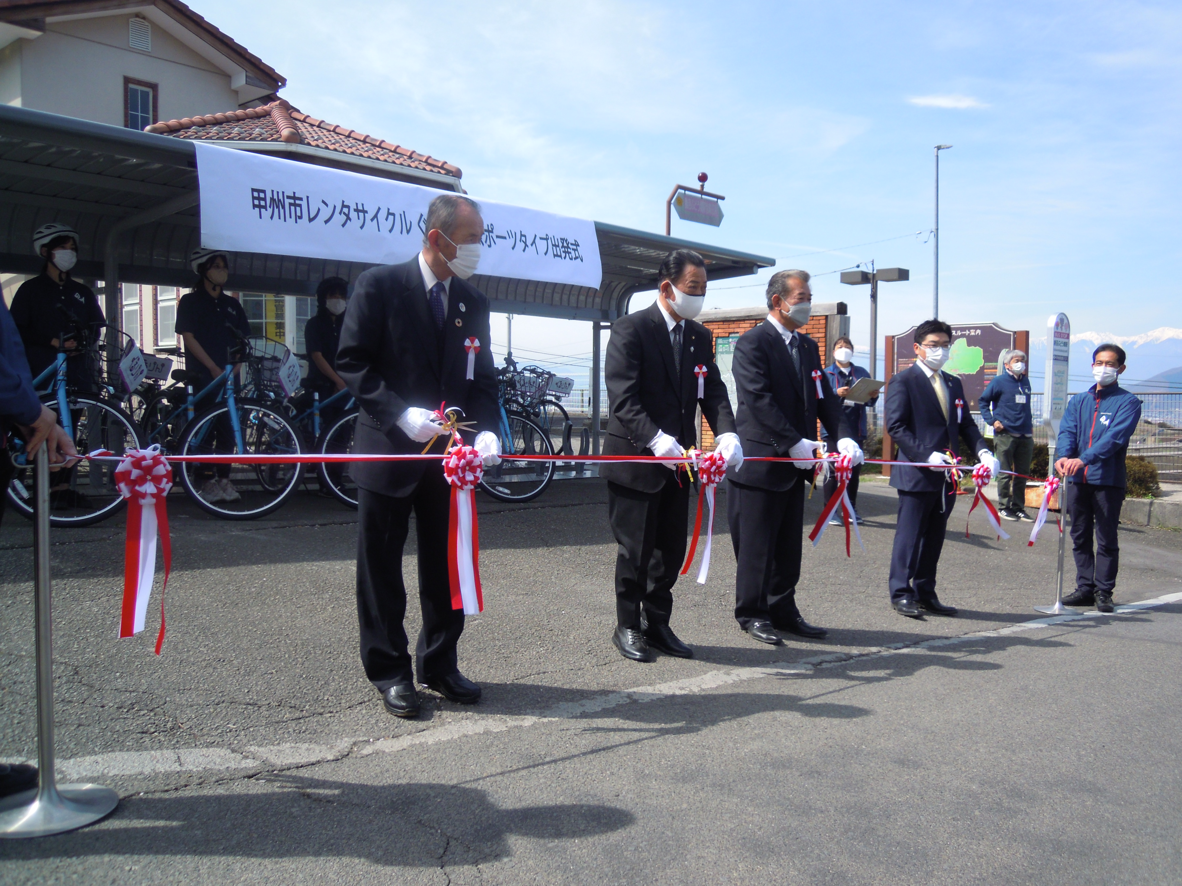 鈴木市長、高畑市議会議長、平塚厚生経済常任委員長、雨宮観光協会会長によるテープカット