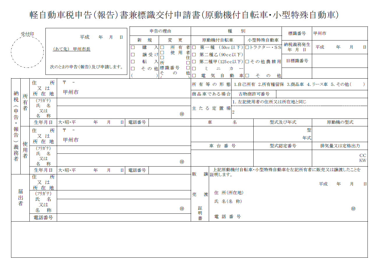 記事番号: 1-558 公開日 2014年11月12日 更新日 2018年04月04日 合併前の塩山市・勝沼町・大和村発行の標識(ナンバープレート)は有効です。 「甲州市」の標識に変更を希望される方は、無料で変更することができます。 必要書類 所有者の印鑑 ナンバープレート 軽自動車税申告(報告)兼標識交付申請書 軽自動車税廃車申告書兼標識返納書 お問い合わせ先 税務課郵便番号:404-8501住所:山梨県甲州市塩山上於曽1085番地1TEL:市民税担当(0553-32-5069)/資産税担当(0553-32-5065)/収納担当(0553-32-5074)