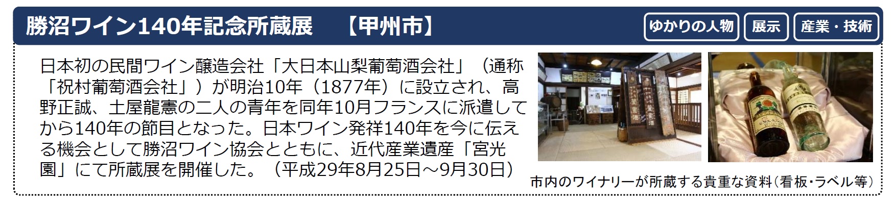 その取り組みを内閣府のホームページで紹介しており、その中で「特色ある『明治150年』関連施策」として、昨年度宮光園で開催した「勝沼ワイン140年記念所蔵展」(勝沼ワイン協会主催)が取り上げられました!