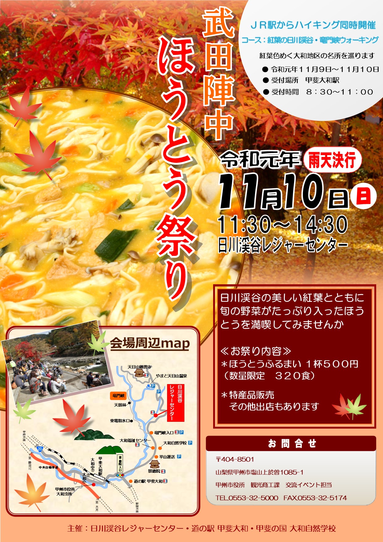 令和元年11月10日(日)日川渓谷レジャーセンターにて、「武田陣中ほうとう祭り」を開催します。