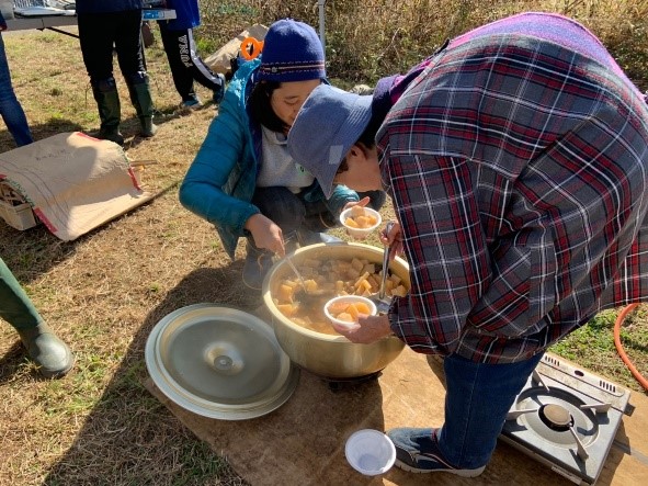 収穫後には活性化する会より、上条で採れた野菜を使った煮物やお漬物が振舞われました。秋の上条の景色を眺めながら、味の染み込んだ煮物に舌鼓を打ちました。また、上条で採れた里芋や白菜、さつまいもや柚子等の直売もあり、参加者の方に大変満足していただけました。