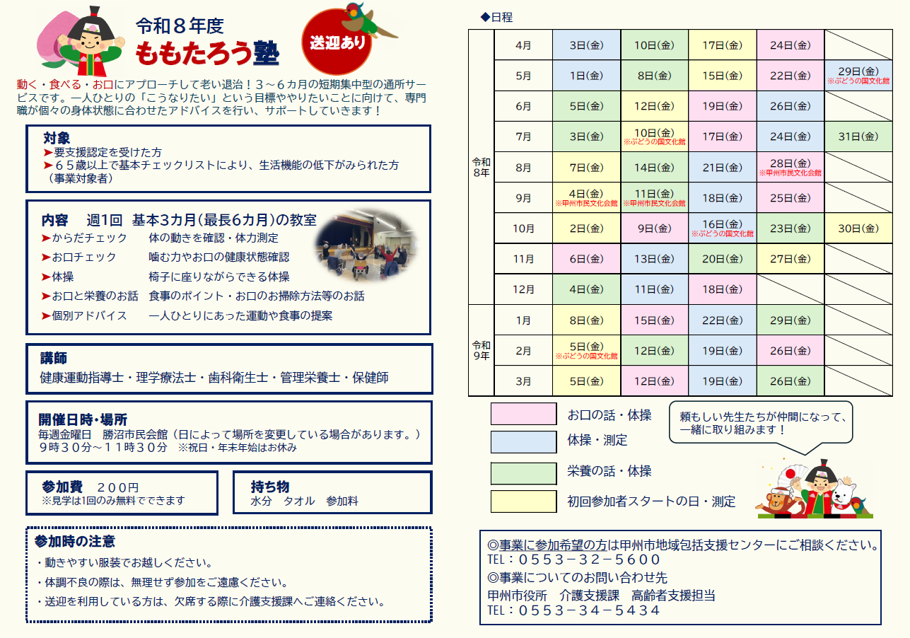 記事番号: 1-115 公開日 2019年05月09日 更新日 2024年04月01日 ご利用を希望される方は、甲州市地域包括支援センター(電話 0553-32-5600)までご相談ください。  ももたろう塾 R8ももたろう塾チラシ[PDF:466KB] お問い合わせ先 介護支援課郵便番号:404-8501住所:山梨県甲州市塩山上於曽1085番地1TEL:介護保険担当(0553-32-5066)/高齢者支援担当(0553-34-5434)