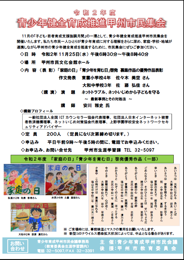 11月は内閣府が主唱する「子供・若者育成支援強調月間」です。青少年育成甲州市民会議では