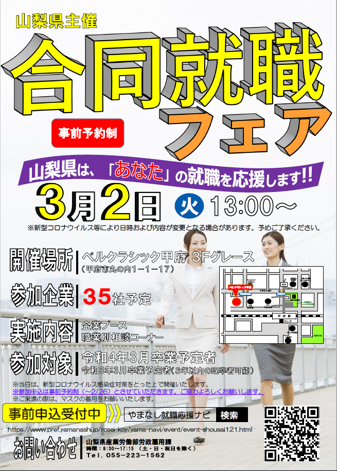 山梨県により令和4年及び令和3年3月新規大学卒業予定者(既卒3年以内含む)の県内への就職と、県内企業への人材確保を支援するための「合同就職フェア」が開催されます。