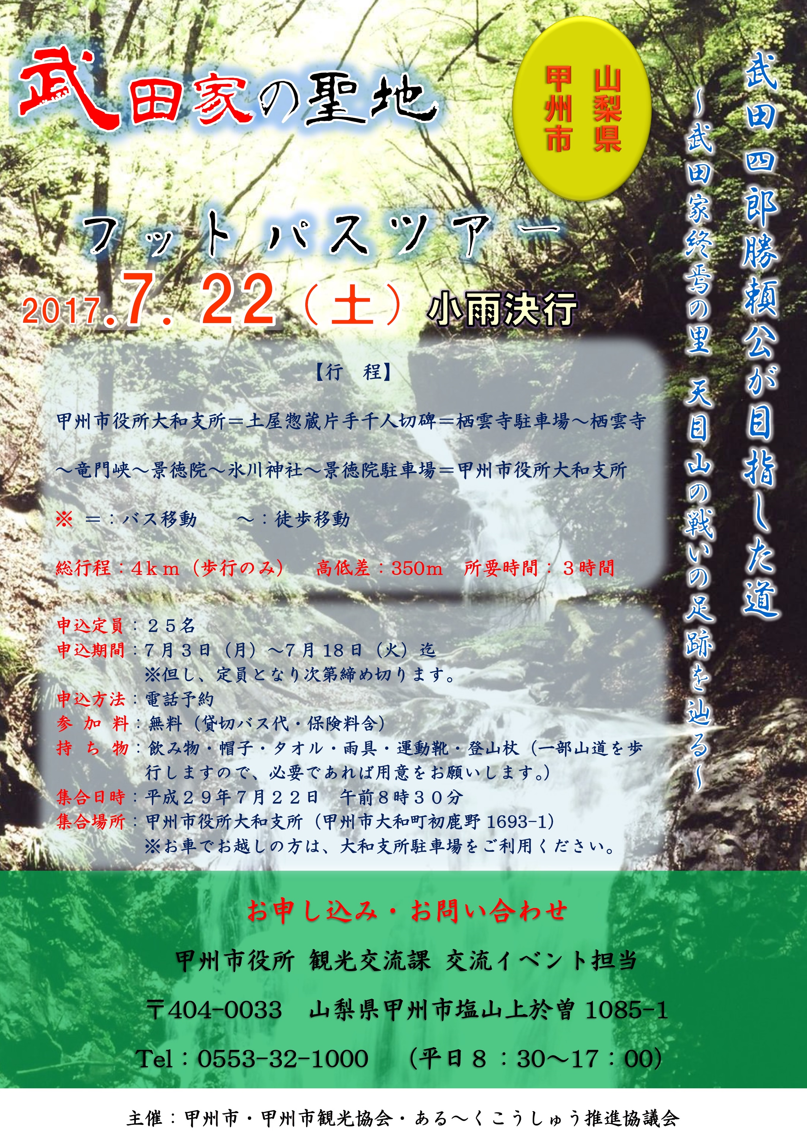 今回のフットパスでは、武田家終焉の地となった甲州市大和町を舞台に、武田勝頼公一行が最期に目指した道を巡り、史跡や遺宝を紹介します。