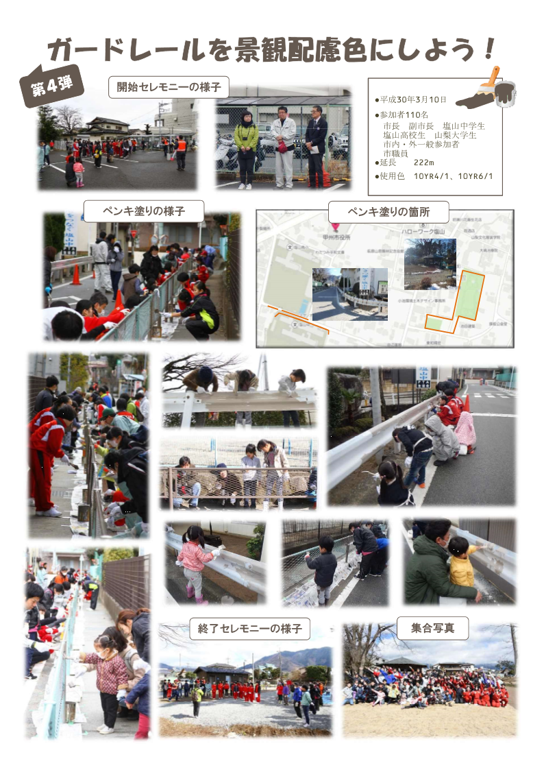 記事番号: 1-1437 公開日 2018年02月07日 更新日 2021年01月20日 ガードレール等を景観配慮色に塗り替えました 平成30年3月10日(土) 塩山中学校周辺及び於曽公園内にある構造物を景観配慮色へ塗り替えました。 第4弾となる今回も、約110名ものボランティアの方々が集まりました! 多くの方々のご協力、本当にありがとうございました! ※画像をクリックで拡大できます。 お問い合わせ先 都市整備課郵便番号:404-8501住所:山梨県甲州市塩山上於曽1085番地1TEL:都市計画担当(0553-32-5072)/空家対策・住宅担当(0553-32-5072)