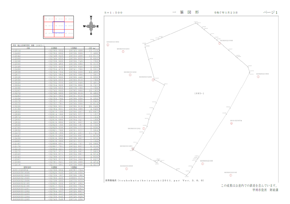 甲州市では、地籍調査事業の登記が完了した地区につきましては、集成図及び一筆図形の図面の交付を行っています。
