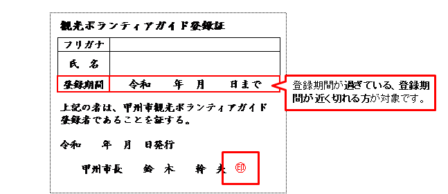 甲州市観光ボランティアガイド登録証をお持ちの方で、登録期間が過ぎている、または、登録期間が近く切れるため更新を希望される場合は、ガイド更新申込書を記入のうえ、甲州市役所観光商工課もしくは、観光商工課メールアドレス(kankou@city.koshu.lg.jp)へ提出をお願いいたします。