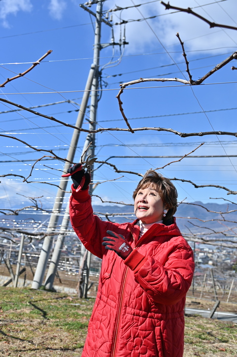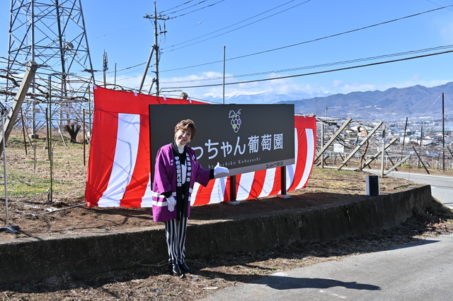 令和5年2月21日(火)に甲州市勝沼町内に所在するワイナリーの圃場において、甲州市観光大使で歌手の小林幸子さんによる「さっちゃん葡萄園」が開設されました。