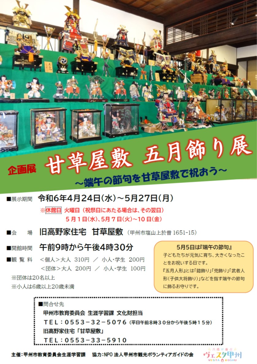国重要文化財 旧高野家住宅(甘草屋敷)では、毎年5月5日の『端午の節句』に合わせて「五月人形」を展示しています。主屋に並んだ約100点の五月人形をぜひご覧ください!