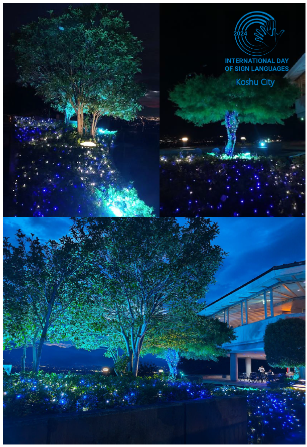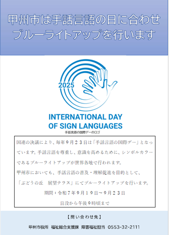 国連の決議により、毎年9月23日は「手話言語の国際デー」となっています。手話言語を尊重し、意識を高めるために、シンボルカラーであるブルーライトアップが世界各地で行われます。