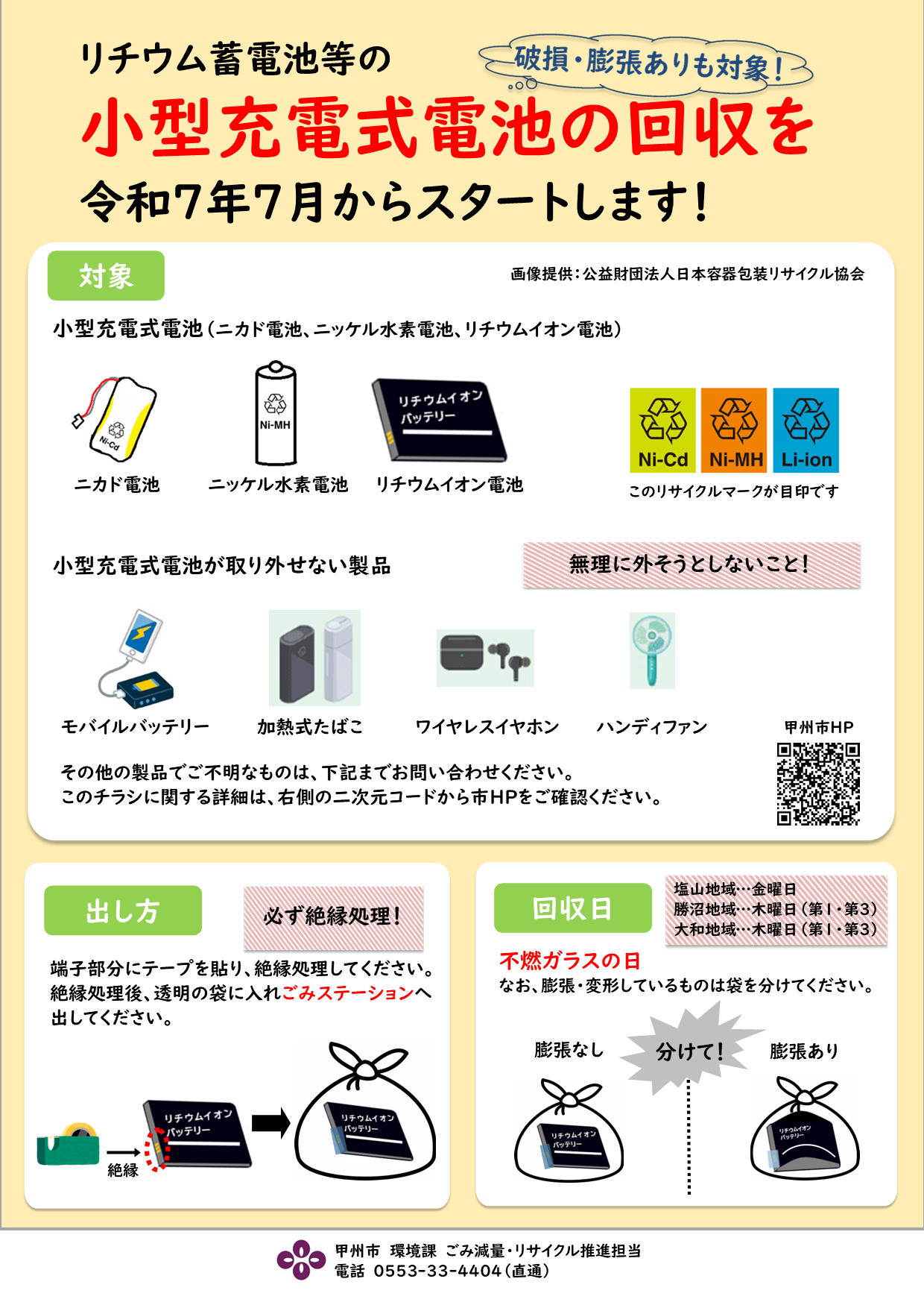 小型充電式電池とは充電すれば繰り返し使える電池のことで、身の回りの多くのコードレス機器・モバイル機器に使用されています。繰り返し使えるため便利な反面、過度な力が加わると発火する可能性があり大変危険です。誤ったごみの分別により、収集車やごみ処理施設などで火災が発生する事故が全国的に発生しています。一般ごみや資源物にリチウム蓄電池等の小型充電式電池が混入することが無いよう、適正な排出をお願いいたします。