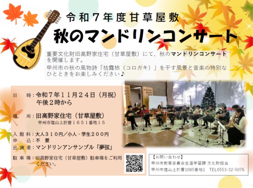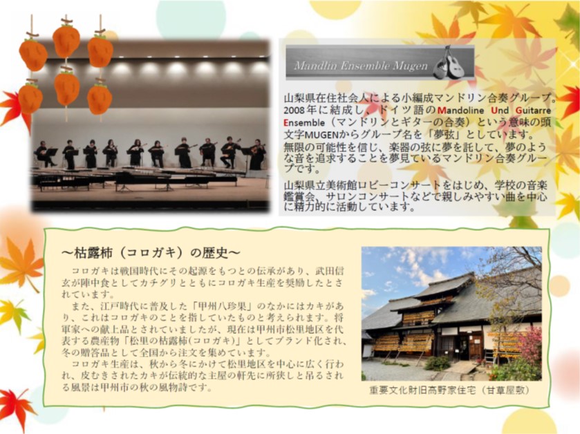 重要文化財旧高野家住宅(甘草屋敷)にてにて、秋のマンドリンコンサートを開催します。甲州市の秋の風物詩「枯露柿(コロガキ)」を干す風景と音楽の特別なひとときをお楽しみください♪
