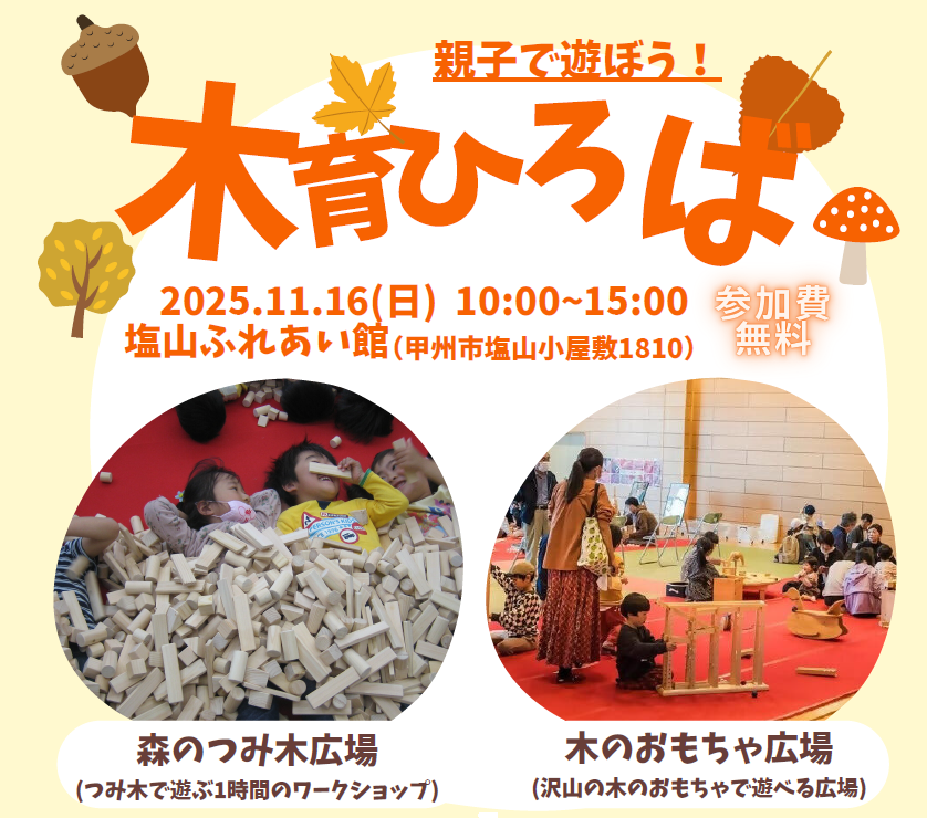 山梨の木のおもちゃで遊ぼう!県産材でつくられたおもちゃで自由に遊べ、赤ちゃんから楽しめます!また、木の特徴や面白さをスタッフが遊びの中でお伝えします。