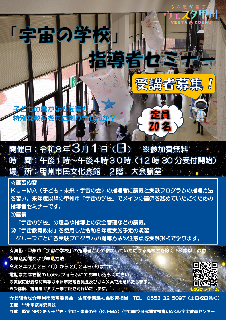対象:甲州市「宇宙の学校」の指導者として参加していただける高校生を除く18歳以上の方