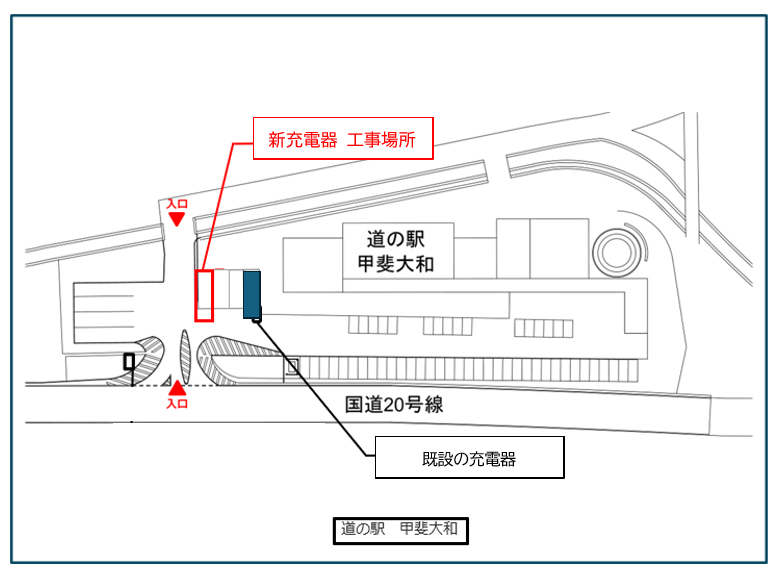 「道の駅 甲斐大和」では、下記のとおり電気自動車用急速充電器の設置工事を実施いたします。工事期間中は、利用者の皆様の安全確保のため、既設の急速充電器をご利用いただくことができません。