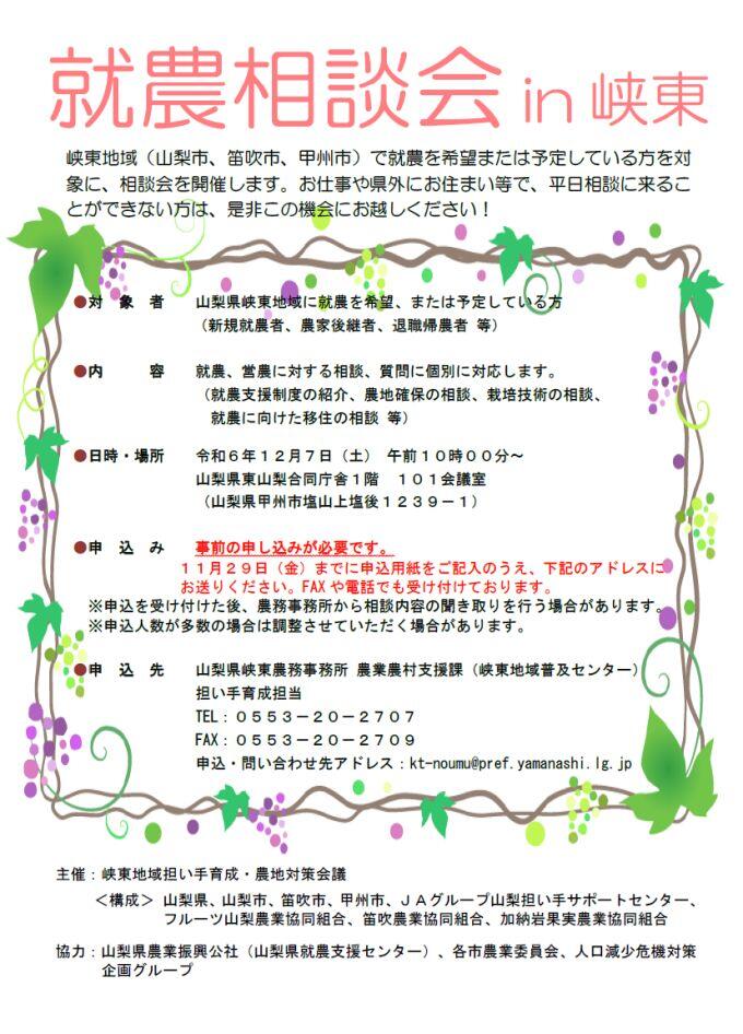 お知らせ イベント 相談会峡東地域(山梨市、笛吹市、甲州市)で就農を希望される方を対象に、相談会を開催します。
